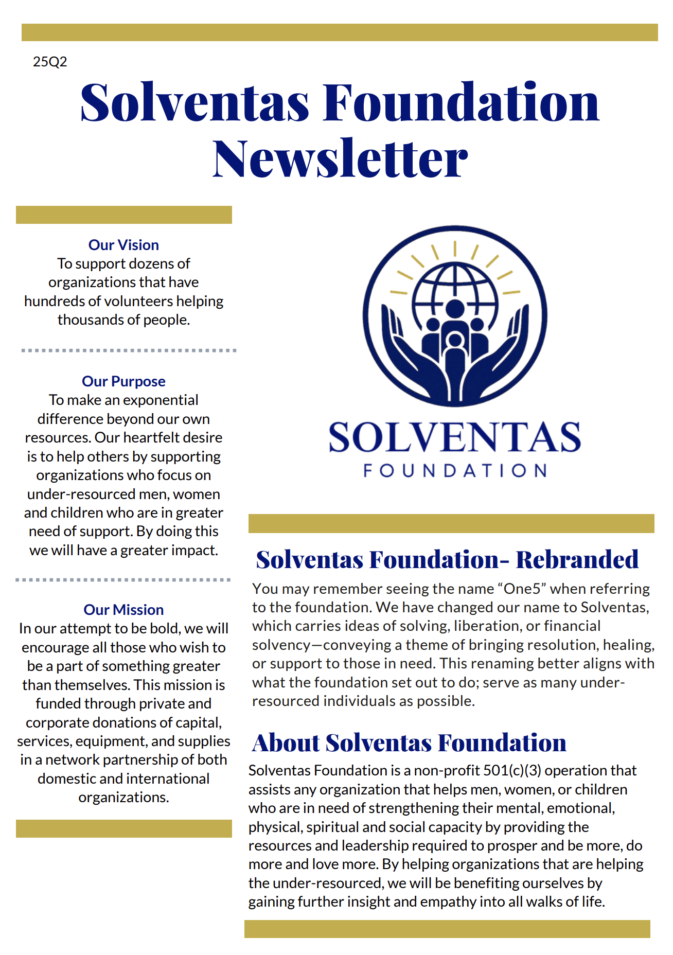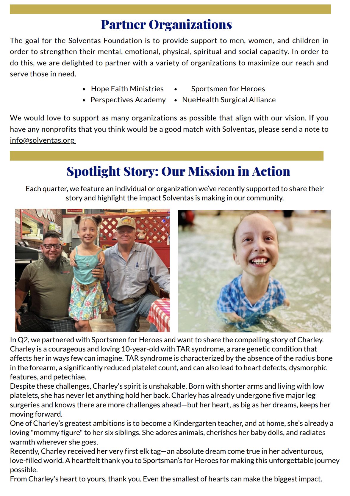 Solventas Foundation announces the foundation’s rebrand from One5 to Solventas and reinforces its commitment to expanding support for under-resourced individuals through strategic partnerships, philanthropy, and volunteer engagement. It highlights several partner organizations and features a spotlight story on Charley, a resilient 10-year-old with TAR syndrome whose dream was advanced through Solventas’ collaboration with Sportsmen for Heroes. The issue concludes with a call for community involvement, inviting supporters to volunteer, contribute financially, and stay connected through the foundation’s social channels.